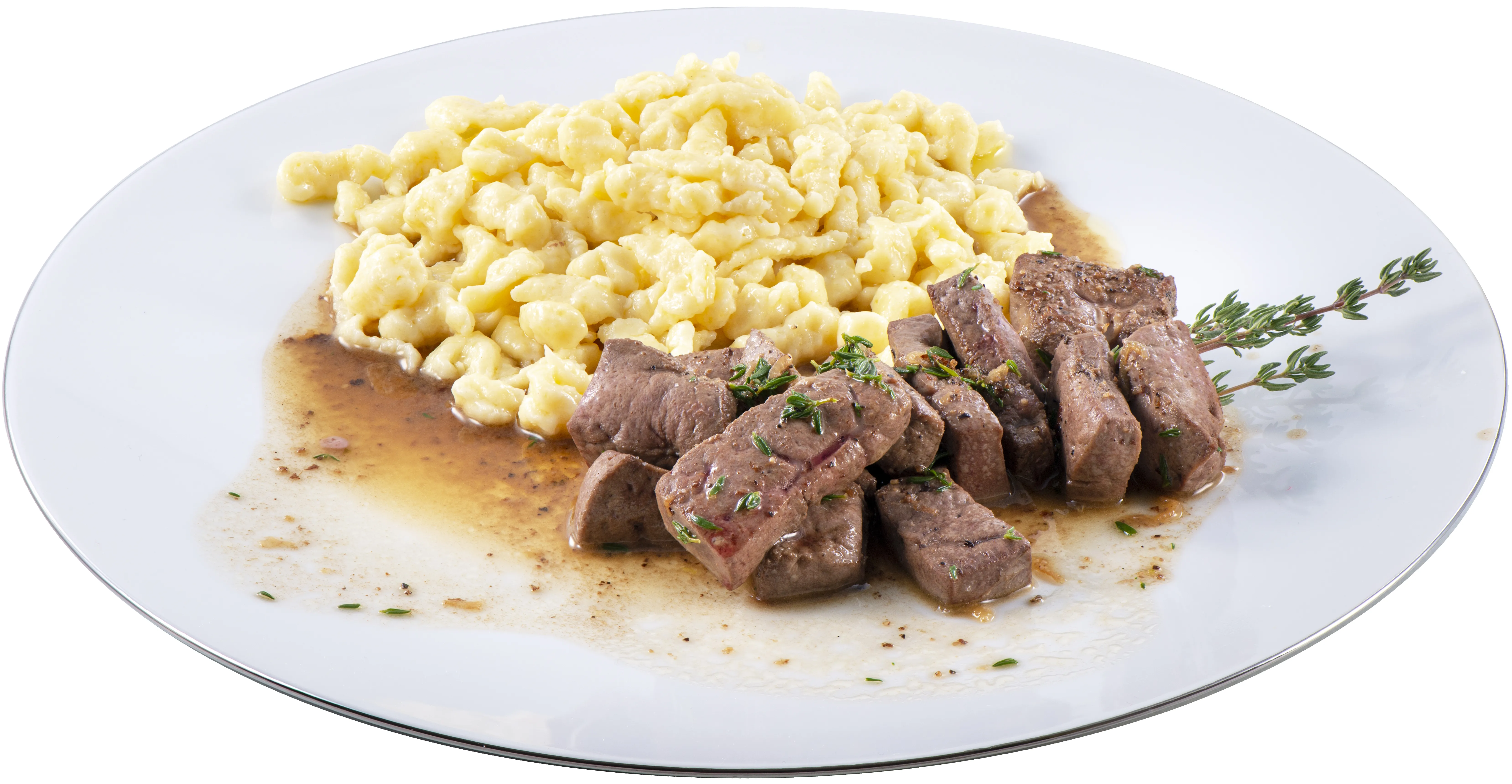 - ③Die 600 gr. geschnetzelte Kalbsleber dazugeben und 2–3 Minuten mitbraten