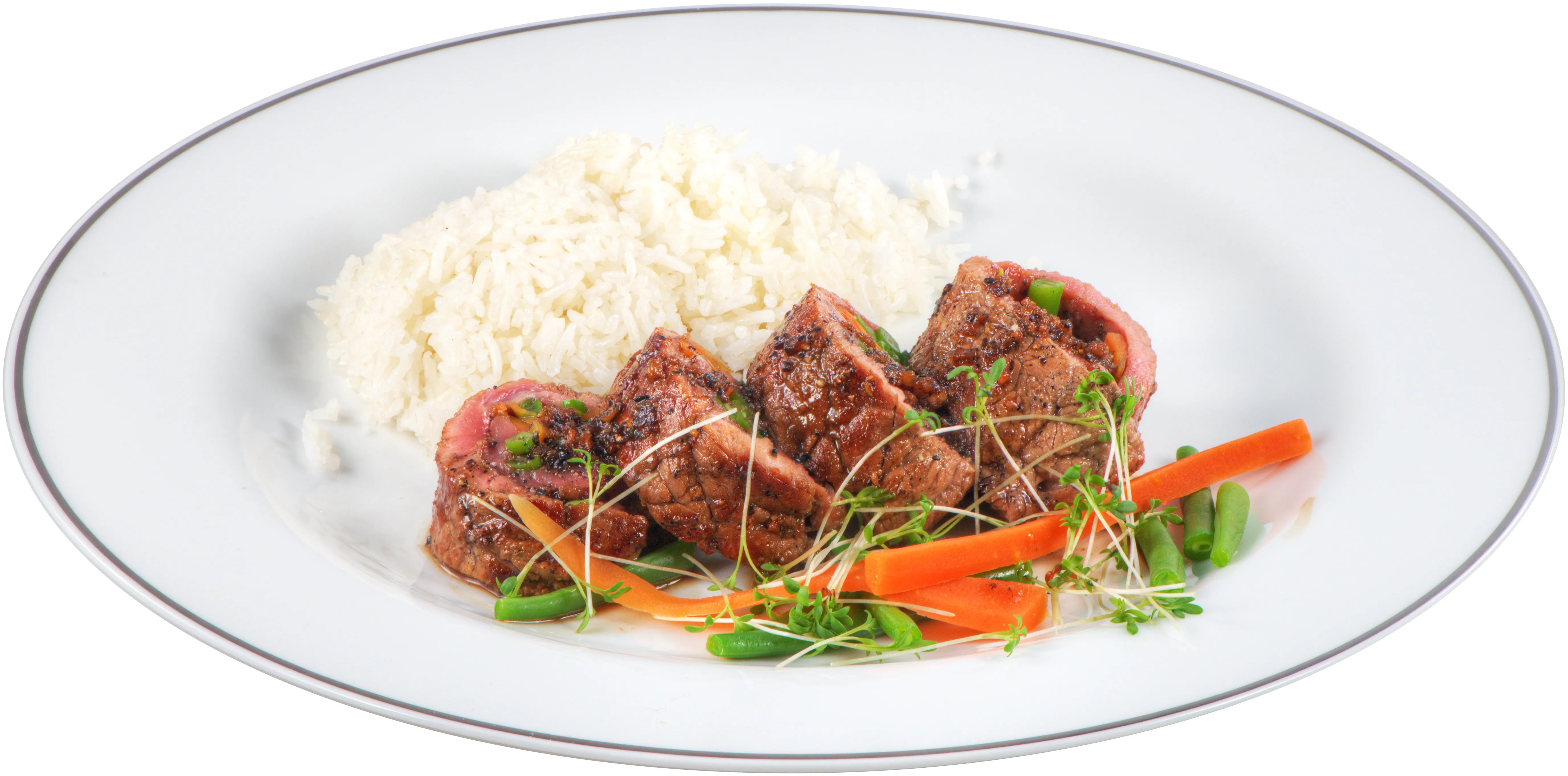 - ⑬Die gebratenen Rollen in 1 - 2 cm breite Scheiben schneiden und auf den Tellern anrichten. Mit der gewärmten Marinade übergiessen. Mit dem evt. übrig gebliebenen Gemüse und optional mit Kresse garnieren