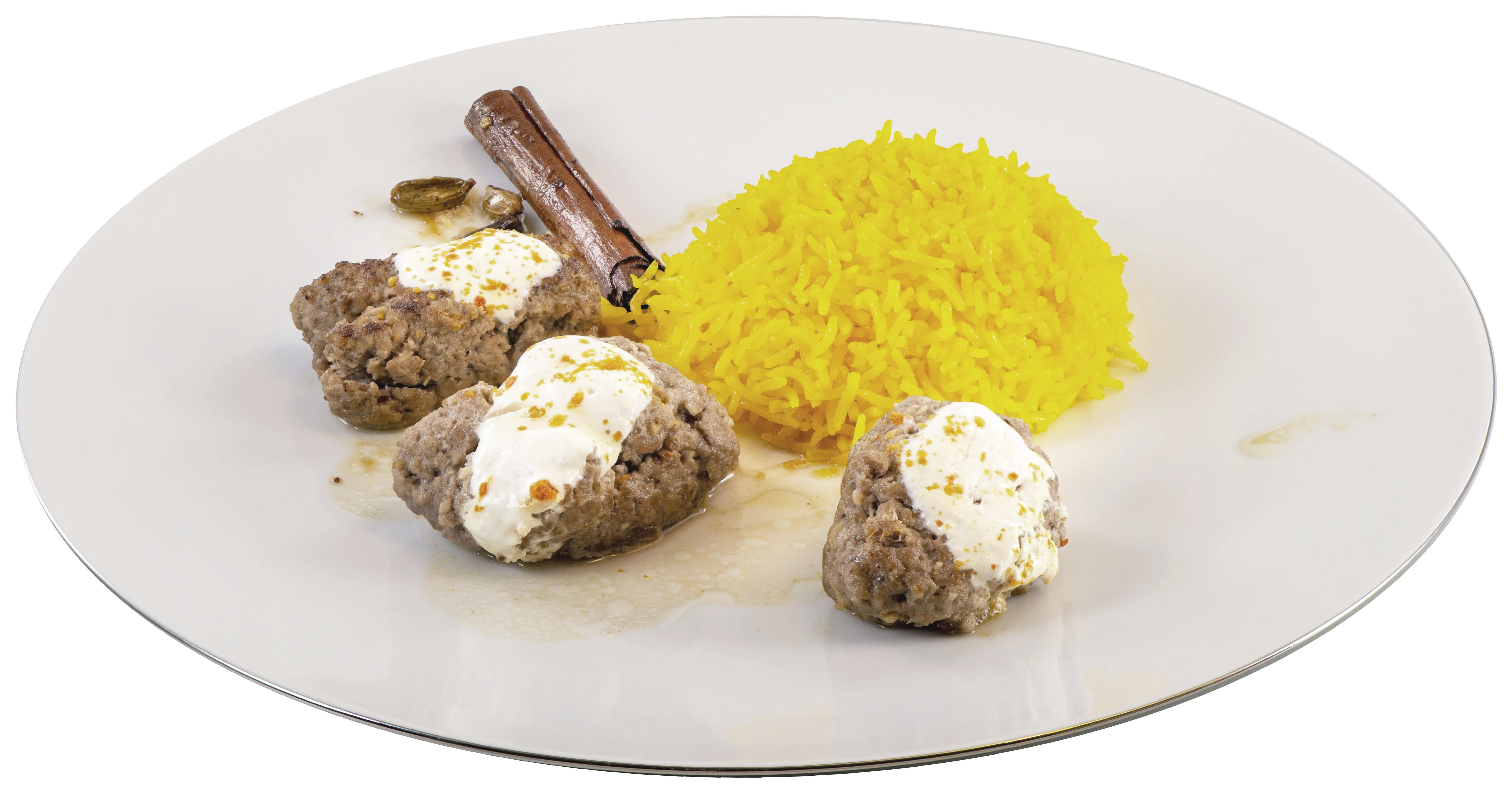 - ⑫Die Koftas mit der Joghurtseite nach oben auf den Tellern anrichten und etwas Bratsatz darüber verteilen