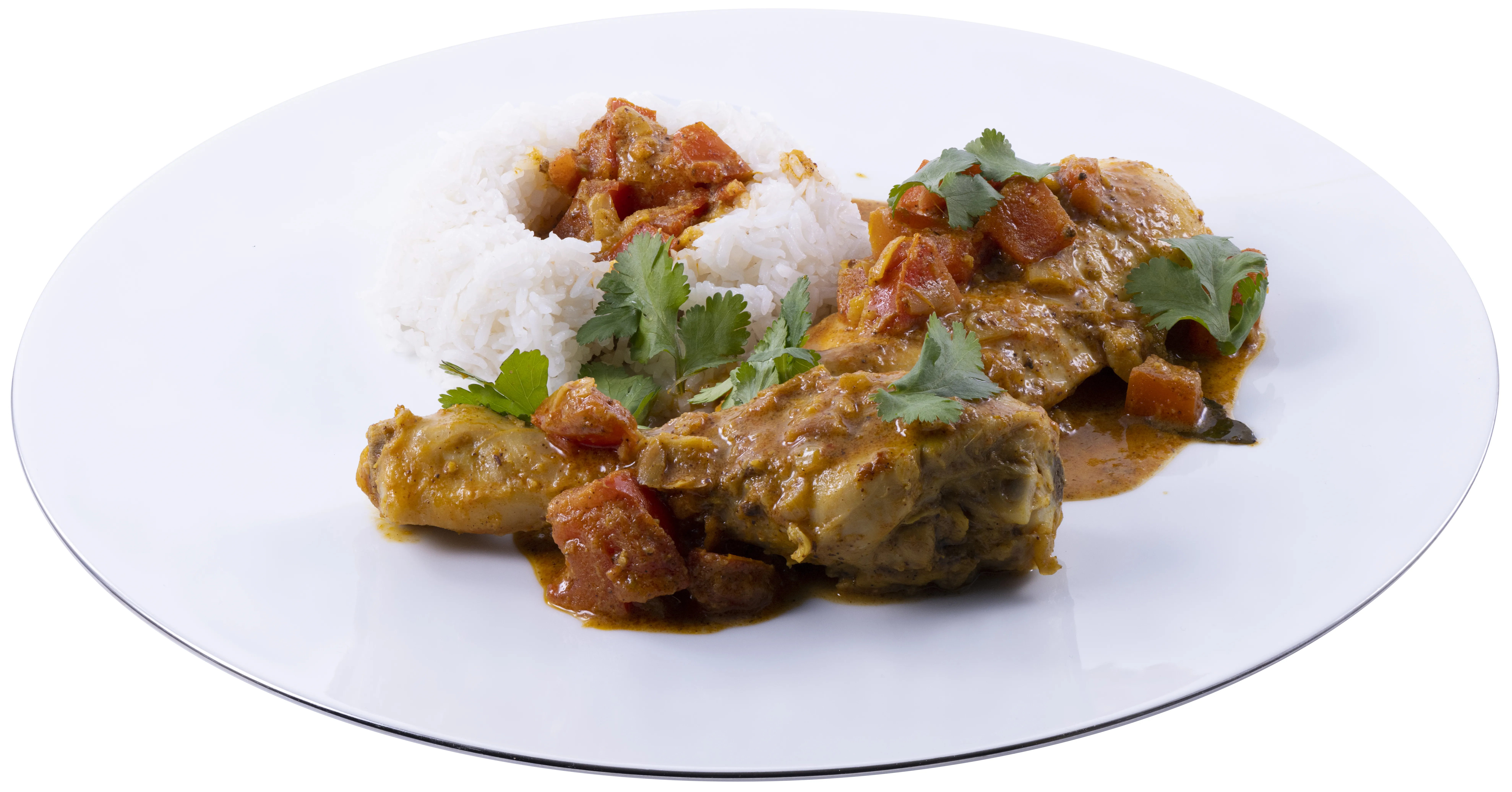 - ⑬Die Hühnerstücke auf die Teller geben, reichlich von der Sauce darüber verteilen und mit dem gehackten Koriander bestreuen. Servieren